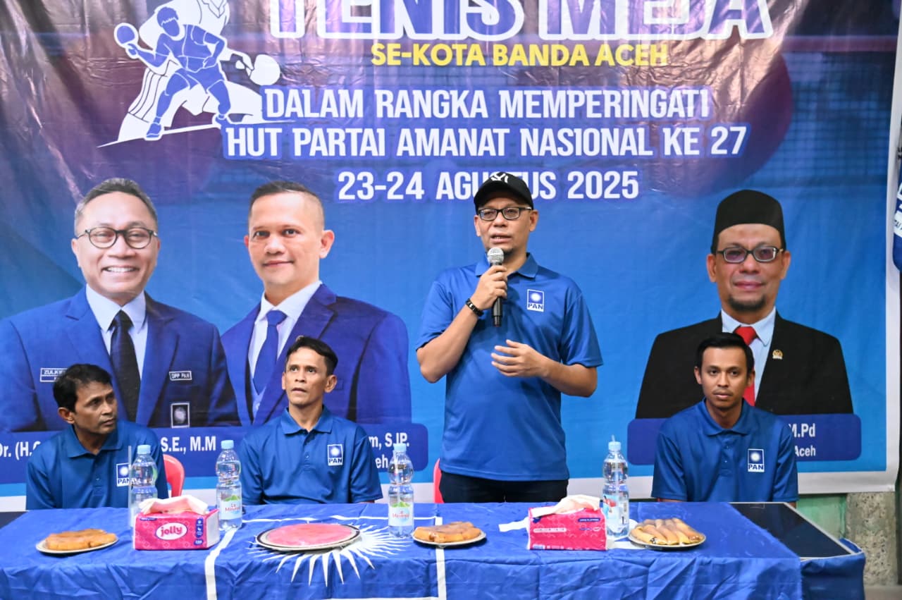 Ketua Harian DPW PAN Aceh, Razami Dek Cut memberi kata sambutan sebelum membuka secara resmi turnamen Tenis Meja se-Kota Banda Aceh dalam rangka memperingati HUT Partai Amanat Nasional ke-27 di Lapangan tenis meja PTM Aneuk Nanggroe, Gampong Ilie, Kecamatan Ulee Kareng, Banda Aceh, Sabtu (23/08/2025). FOTO/BEDU SAINI