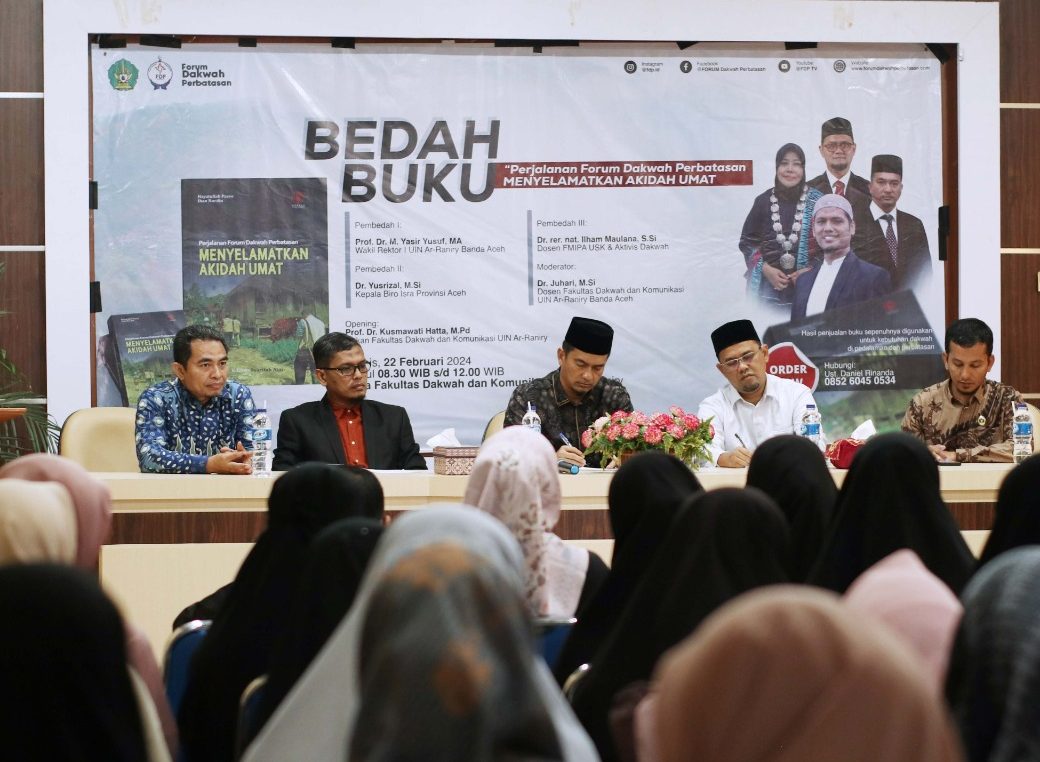 Acara bedah buku yang diselenggarakan oleh Fakultas Dakwah dan Komunikasi (FDK) UIN Ar-Raniry bekerjasama dengan Forum Dakwah Perbatasan (FDP) di Aula Fakultas setempat, Kamis (22/2/2024). FOTO/DOK FDK UIN AR RANIRY