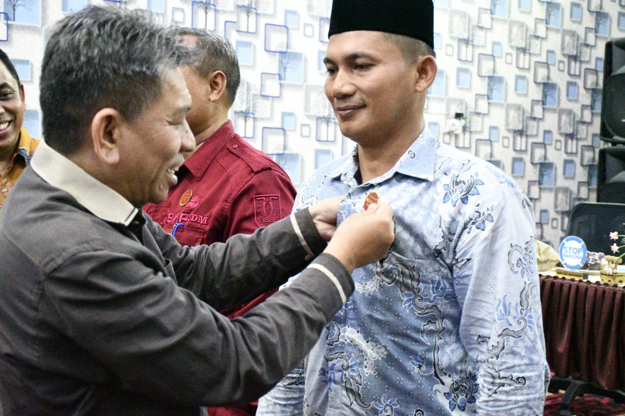 Zulfikar Lidan melakukan penyematan pin penggiat P4GN secara simbolis kepada peserta Kegiatan Workshop Penggiat P4GN, di Museum Sabang, Kamis, (13/6/2024). FOTO/ BNNK SABANG
